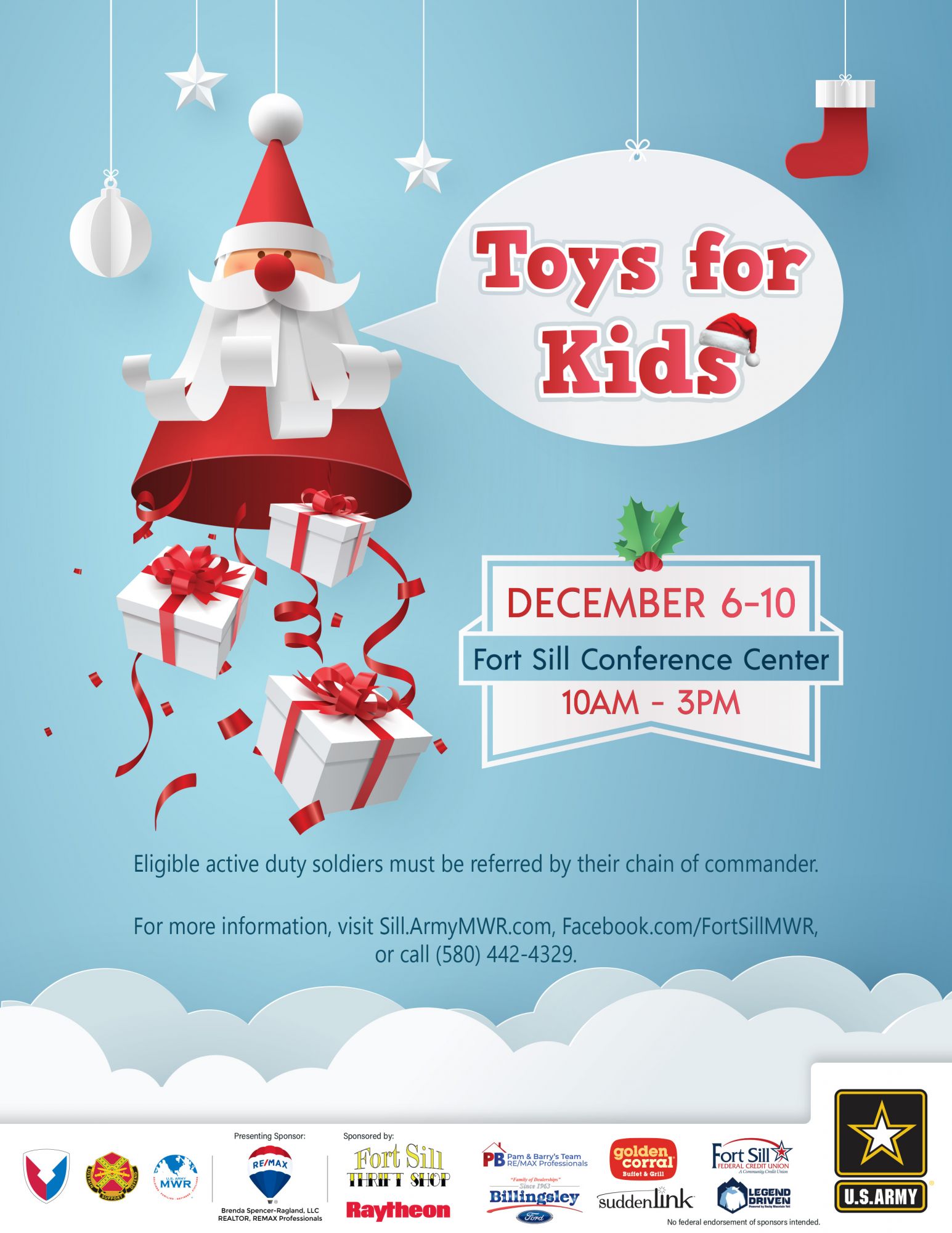 Toys for Kids will take place at the Fort Sill Conference Center from 10 a.m. to 3 p.m. December 6-10. This program is designed for Active Duty personnel E-4 and below with minor children, who may be experiencing financial hardships during this holiday season. This is a command referral program (Battery Commander or 1SG), and eligible participants must be referred by their command channels. Each child will receive two toys.